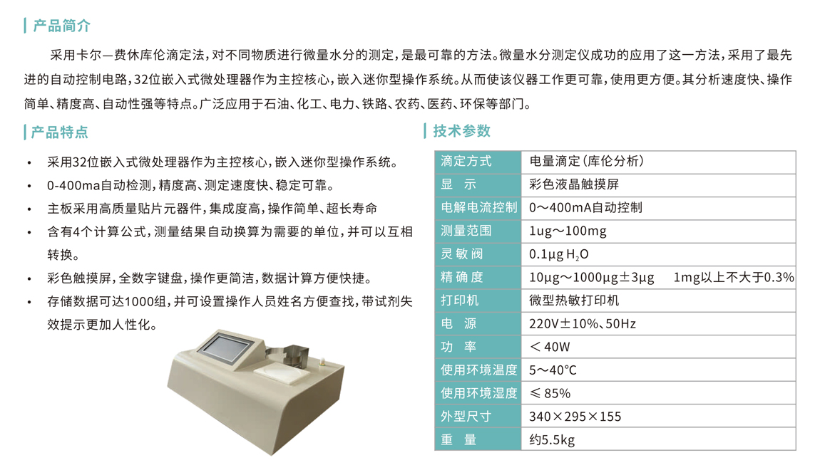 采用卡爾一費休庫倫滴定法,對不同物質進行微量水分的測定,是最可靠的方法。微量水分測定儀成功的應用了這一方法,采用了最先 進的自動控制電路,32位嵌入式微處理器作為主控核心,嵌入迷你型操作系統(tǒng)。從而使該儀器工作更可靠,使用更方便。其分析速度快、操作 簡單、精度高、自動性強等特點。廣泛應用于石油、化工、電力、鐵路、農藥、醫(yī)藥、環(huán)保等部門。