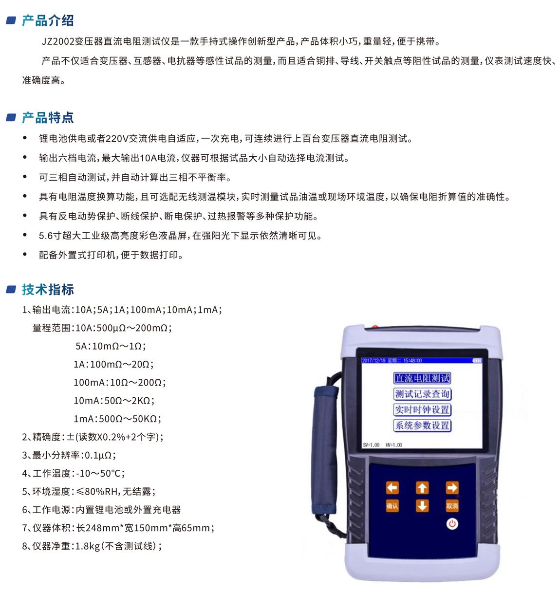 JZ2002變壓器直流電阻測試儀是一款手持式操作創(chuàng)新型產(chǎn)品,產(chǎn)品體積小巧,重量輕,便于攜帶。 產(chǎn)品不僅適合變壓器、互感器、電抗器等感性試品的測量,而且適合銅排、導(dǎo)線、開關(guān)觸點等阻性試品的測量,儀表測試速度快、 準(zhǔn)確度高。